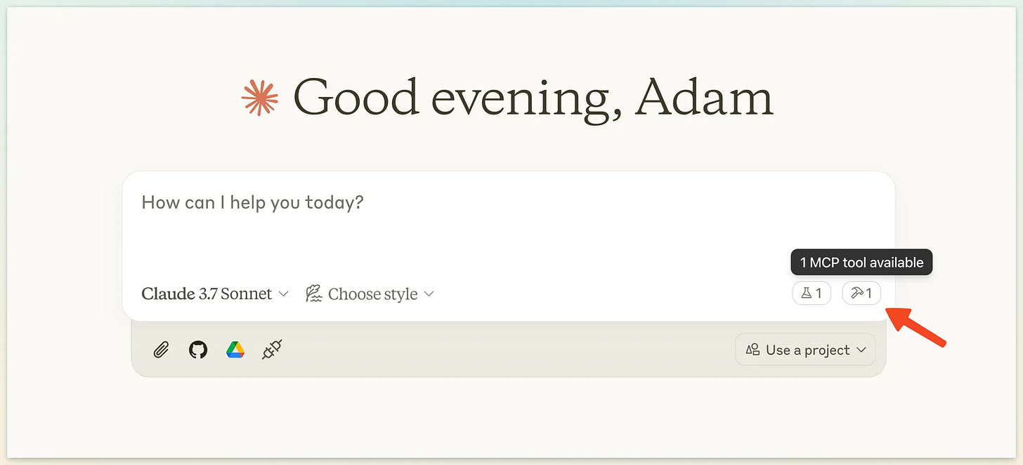 When you restart Claude, you should see a small hammer icon in the bottom-right corner of the chat interface. This indicates that Claude now has access to tools - specifically, the Fetch tool we just configured.