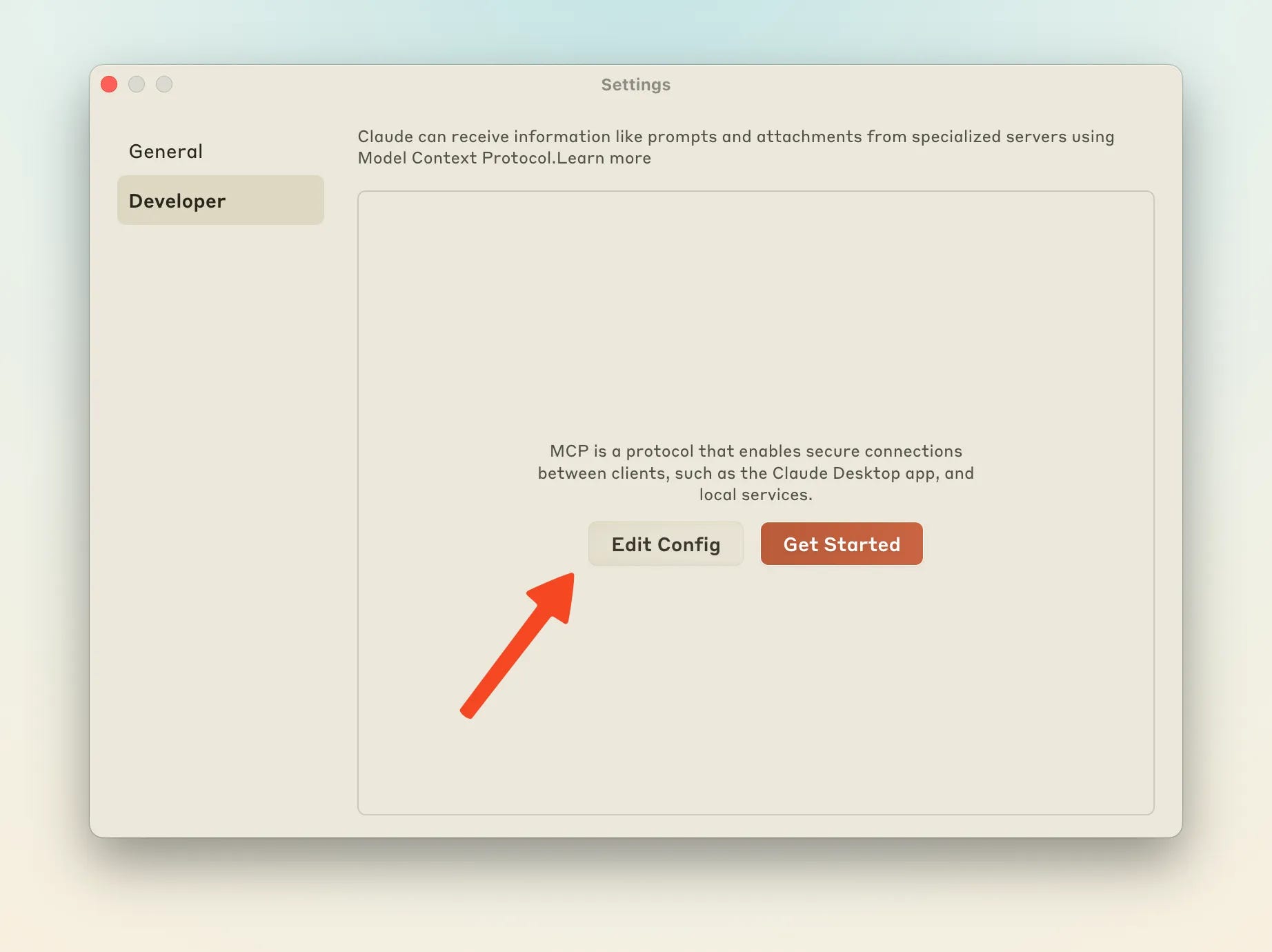 Mac: Click on the "Claude" menu, then "Settings", and select the "Developer" tab