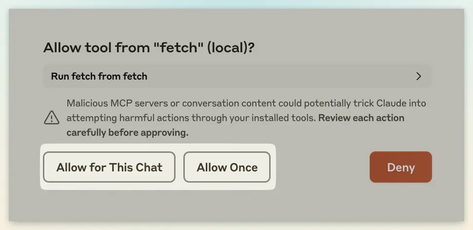 Claude Desktop app will show you a prompt asking for your permission to allow the tool to perform an action. Make sure to review actions carefully prior to approving them.